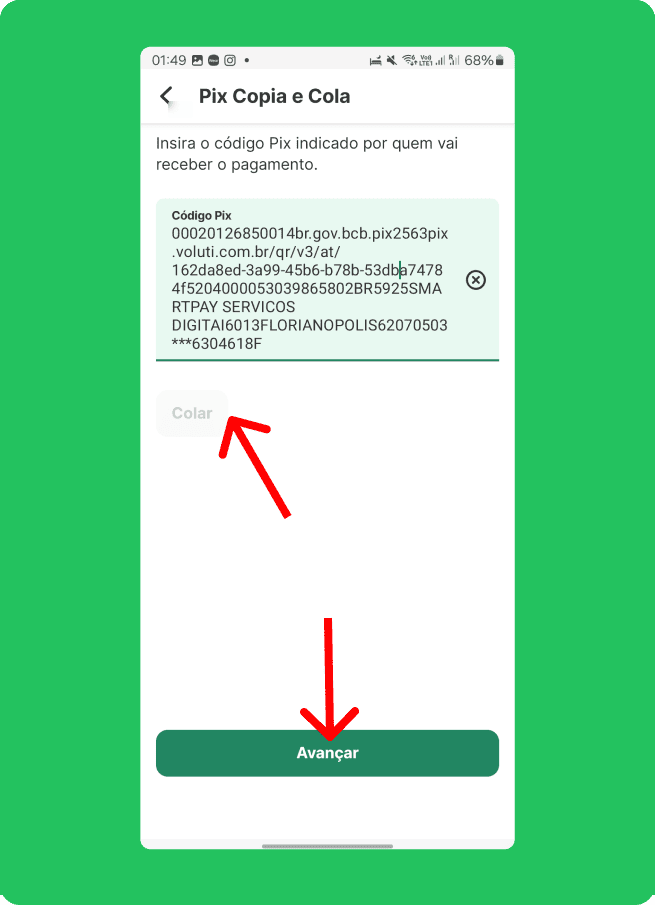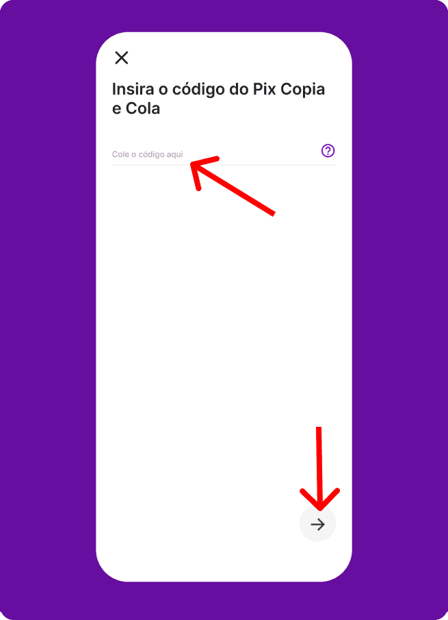 Cole o "Código PIX" e clique no "Botão de Seta" para avançar.