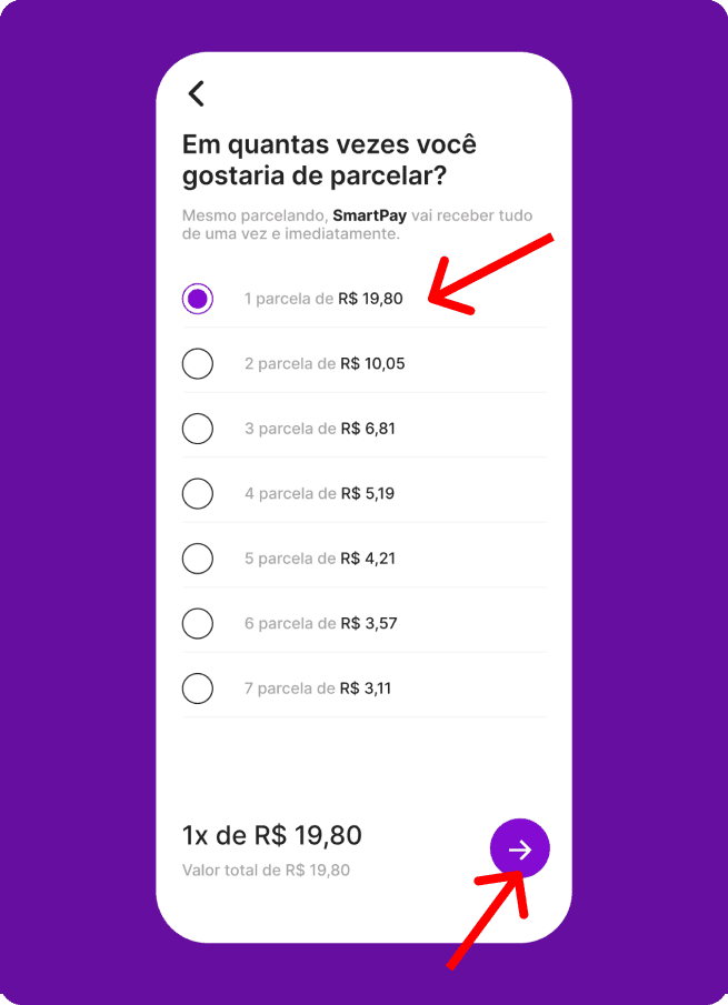 Selecione o número de parcelas que deseja pagar e clique no "Botão de Seta" para realizar o pagamento.